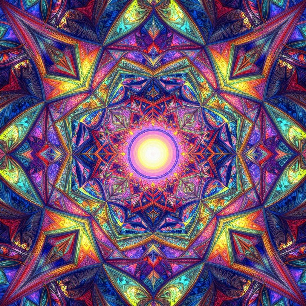 Vibrant digital artwork featuring a bright, glowing center surrounded by intricate, multicolored, starburst patterns with radiant hues of purple, yellow,