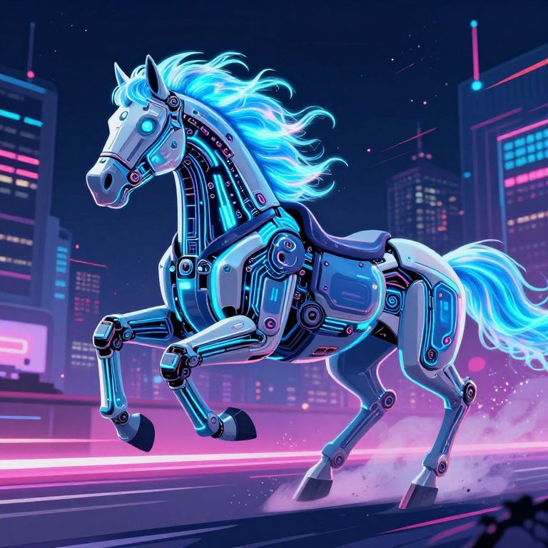 Rosinante, portrayed as a futuristic cybernetic horse with neon blue circuits and holographic mane, racing across a neon-lit cityscape at night, illustrated in a vibrant cyberpunk style with dynamic lighting and sharp contrasts.