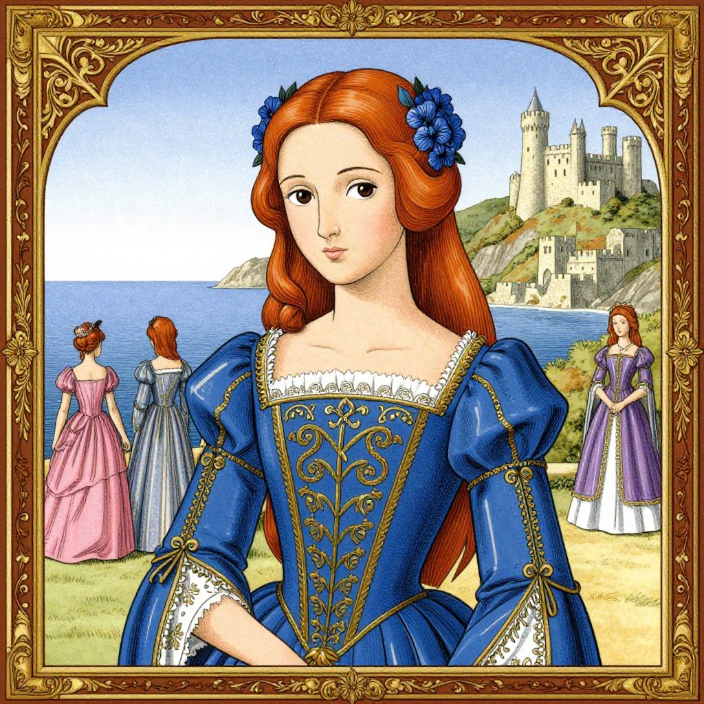 Illustration of a red-haired woman in a blue Renaissance-style dress with intricate gold details. The artwork features fine inking lines and flat colors, combining elements of Pre-Raphaelite and shoujo manga styles. She is adorned with blue flowers in her hair, set against a coastal background with two other figures and a hillside castle. The image is framed with a decorative border inspired by classical art.