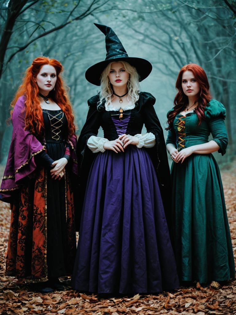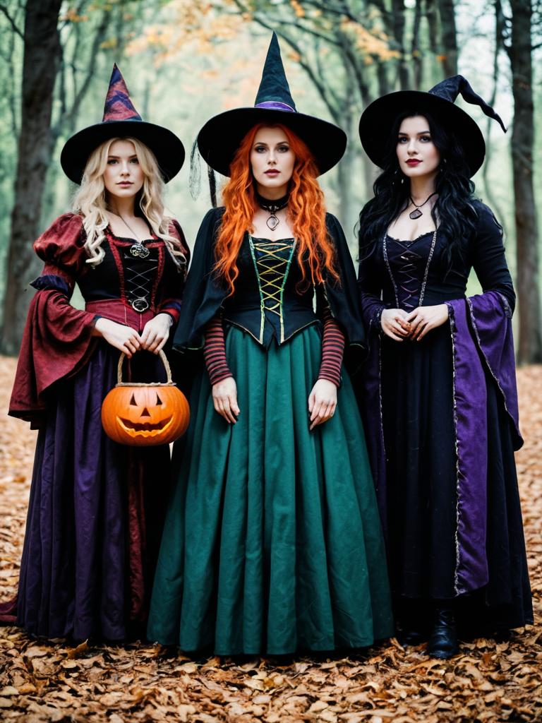 Full-body photo of three women dressed in detailed witch costumes, standing outdoors in a forest setting with autumn leaves on the ground. Each woman wears a pointed witch hat and long flowing dresses with puffed sleeves in different colors - black and green, deep green with rust cape, and purple with black. The woman in the center holds a small broomstick. The costumes evoke a classic fantasy witch style.