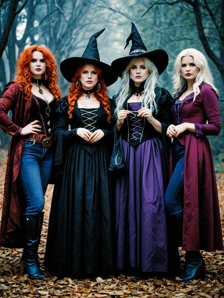 Group in Hocus Pocus Cosplay, full-body cosplay photo with witch outfits