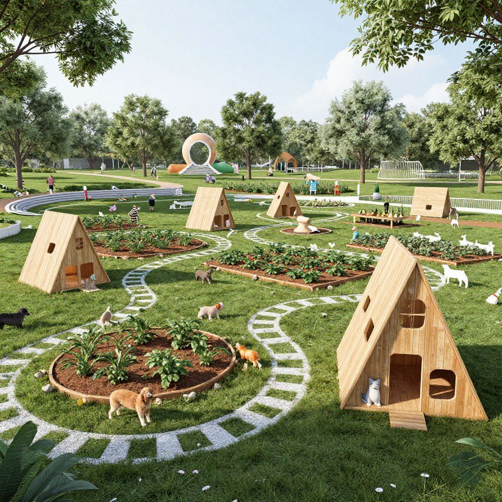 Rendering 120,000 square meters of modern parent-child camp, with planting area, picking area, pet area, and other multi-functional space, triangle room with dogs cats and birds in the park,