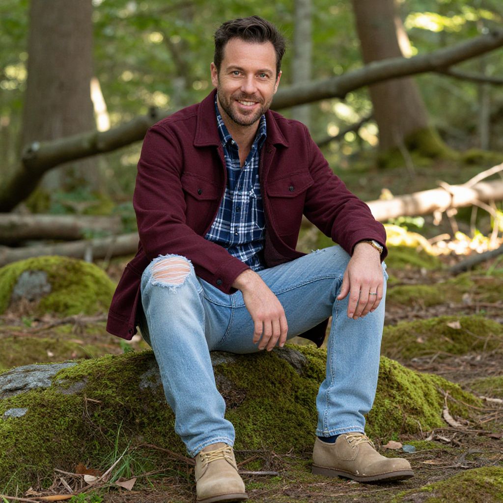 A man, burgundy flannel lined jacket, distressed light blue jeans, tan suede chukka boots, navy plaid button-up shirt, tranquil forest glade, soft moss underfoot, dappled sunlight filtering through branches, vibrant colors, relaxed smile, inviting demeanor.Man has masculine face and piercing eyes