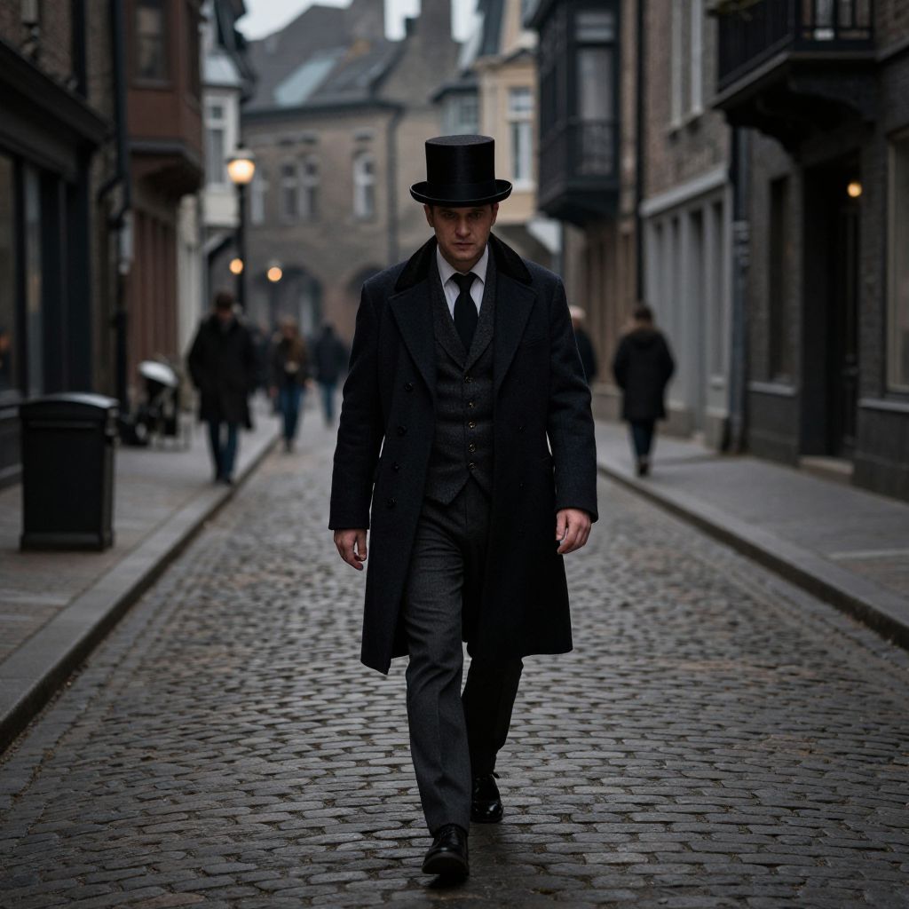Photograph of a solitary man walking down a narrow, cobblestone street in a dimly lit, urban setting. He is dressed in a dark, three-piece suit with a long, black overcoat and a black top hat. His dark suit contrasts with the lighter, blurry background of buildings and faintly visible street lamps. The man's expression is neutral, and he walks with a steady, deliberate pace. The street is flanked by dark brick buildings on either side, with a few indistinct, blurry figures in the distance. The overall color palette is muted, with shades of black, gray, and brown dominating the scene.