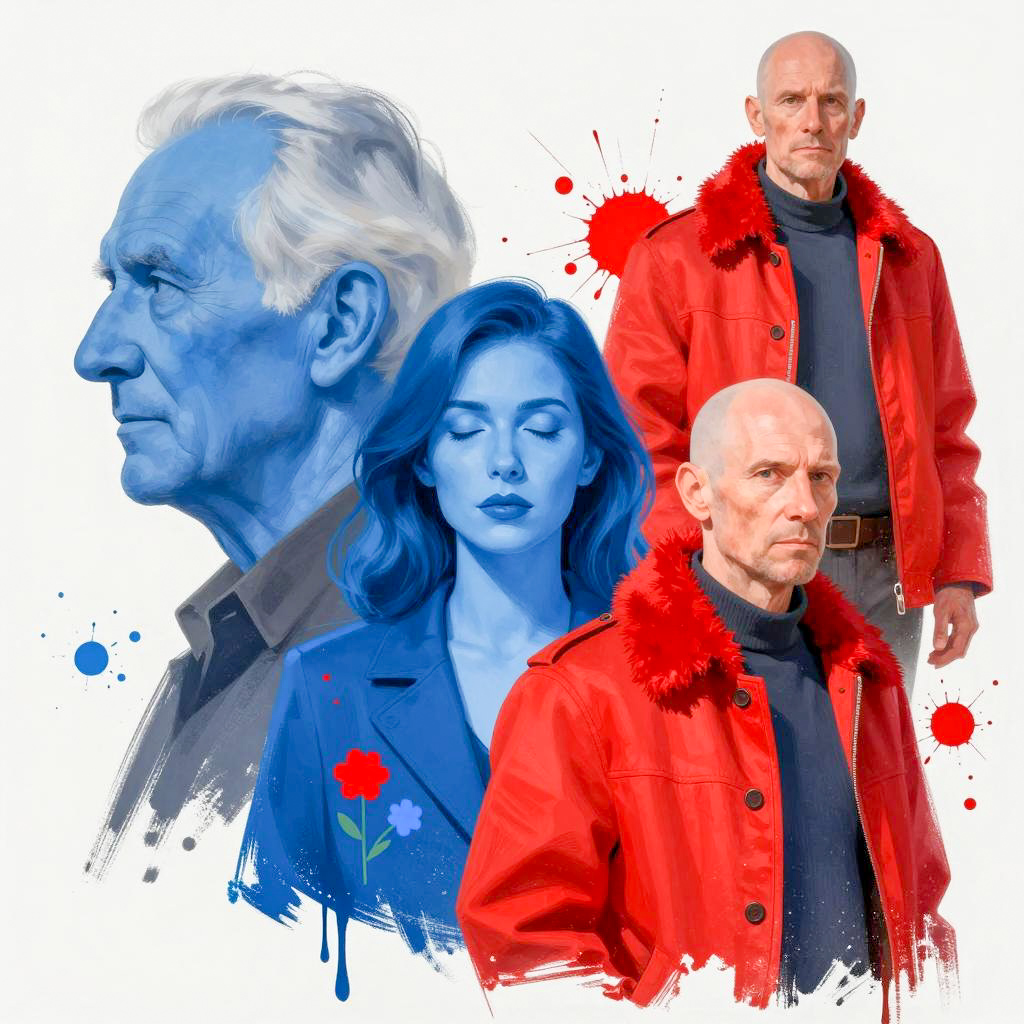 Digital illustration of three individuals. Left: profile of an elderly man with blue face and white background. Center: woman with blue face, closed eyes, wearing blue jacket, adorned with red and blue flowers. Right: bald man in red coat with red fur collar, standing against red splattered background. Top right: same man in red coat, standing against red and white splattered background. Intense expressions. Blue and red color palette. Abstract, splattered style.