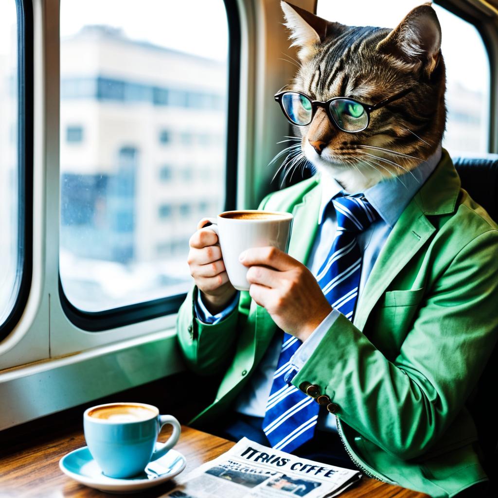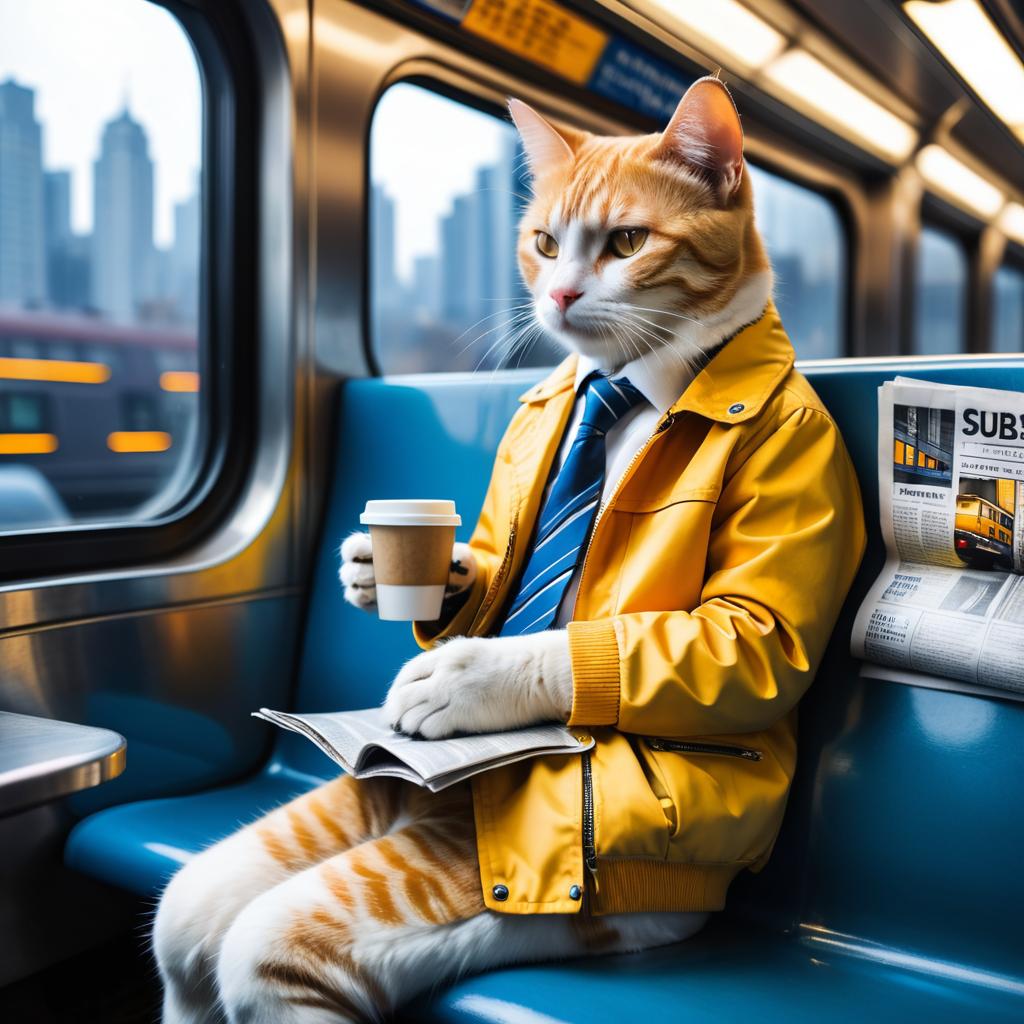 An adorable orange and white cat wearing a yellow jacket and blue tie, sitting on a blue seat inside a subway train, drinking coffee with a newspaper on the seat beside it, city buildings visible through the window, realistic detailed digital painting, warm and soft lighting creating a cozy atmosphere