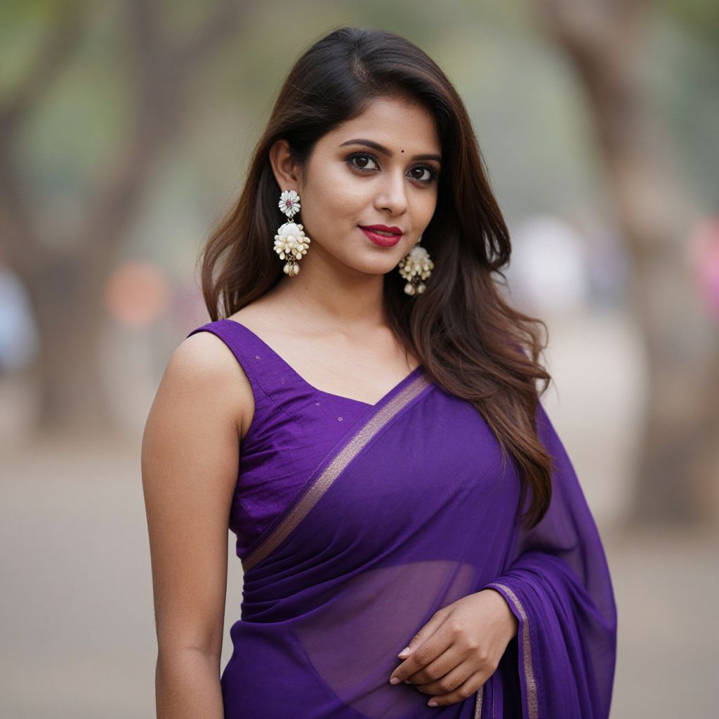 Photograph of an Indian woman with long dark hair, wearing a purple saree, gold earrings, and red lipstick, standing outdoors.