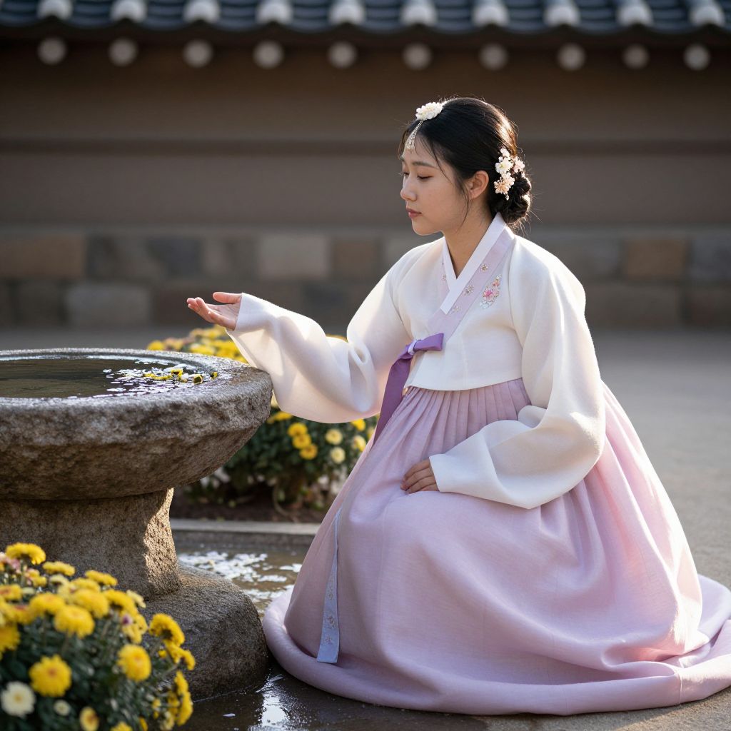 Photograph of a young Asian woman with fair skin and black hair in a traditional Korean hanbok. She is kneeling beside a stone basin filled with water, adorned with yellow flowers. She wears a white long-sleeved top with a lavender skirt, and a purple ribbon tied at her waist. Her hair is neatly tied back with a small hairpin. The background features a blurred wooden building with traditional Korean roof tiles. The sunlight highlights her serene expression and the soft, flowing fabric of her hanbok. The scene evokes a sense of calm and cultural tradition.