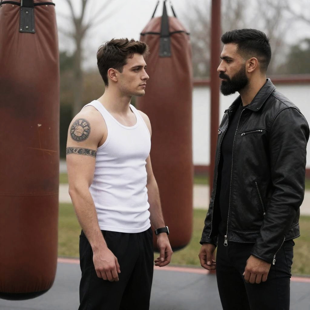 Photograph of two men standing outdoors in front of a worn, brown punching bag. The man on the left has dark hair, a muscular build, tattoos on his right arm, wearing a white tank top and black pants. The man on the right has a black beard, dark hair, wearing a black leather jacket and black pants. Both men look at each other intently. Background includes bare trees and a white structure.
