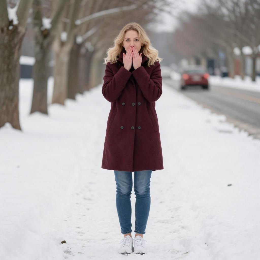 Photograph of a blonde woman standing on a snowy, tree-lined road. She wears a maroon coat, blue jeans, and gray gloves, with her hands covering her mouth in a surprised expression. Snow-covered ground and trees in the background. Bright daylight illuminates the scene.