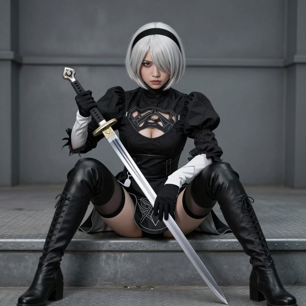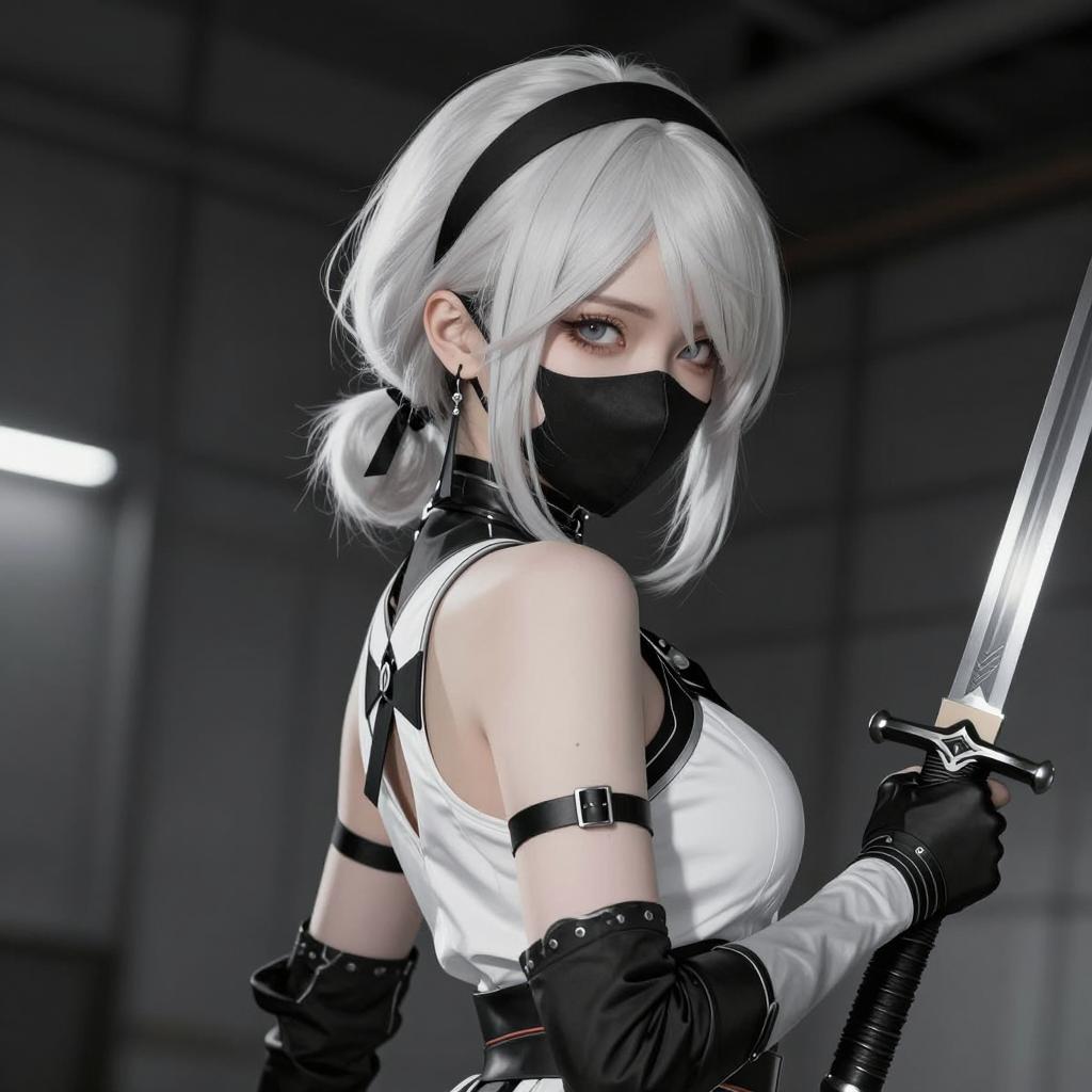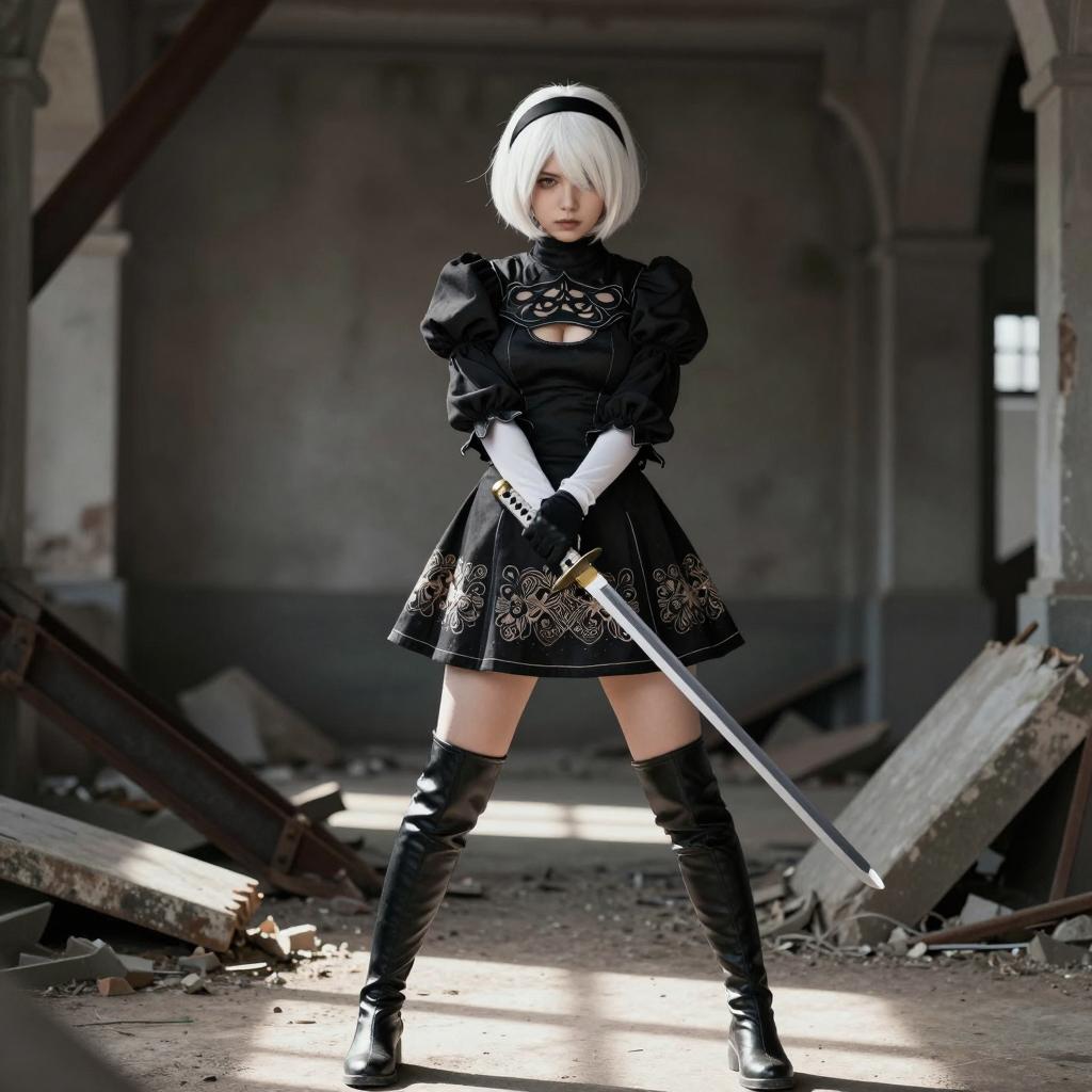 Female character with pale skin and white hair, wearing black military-style dress with silver trim, black hat, black belt with buckles, black leggings, and black lace-up boots. Holding a black sword in her right hand. Background includes ruined, gray, smoke-filled urban setting with debris and broken structures. Her expression is neutral. She stands with legs slightly apart and arms at her sides. Artistically styled digital illustration.