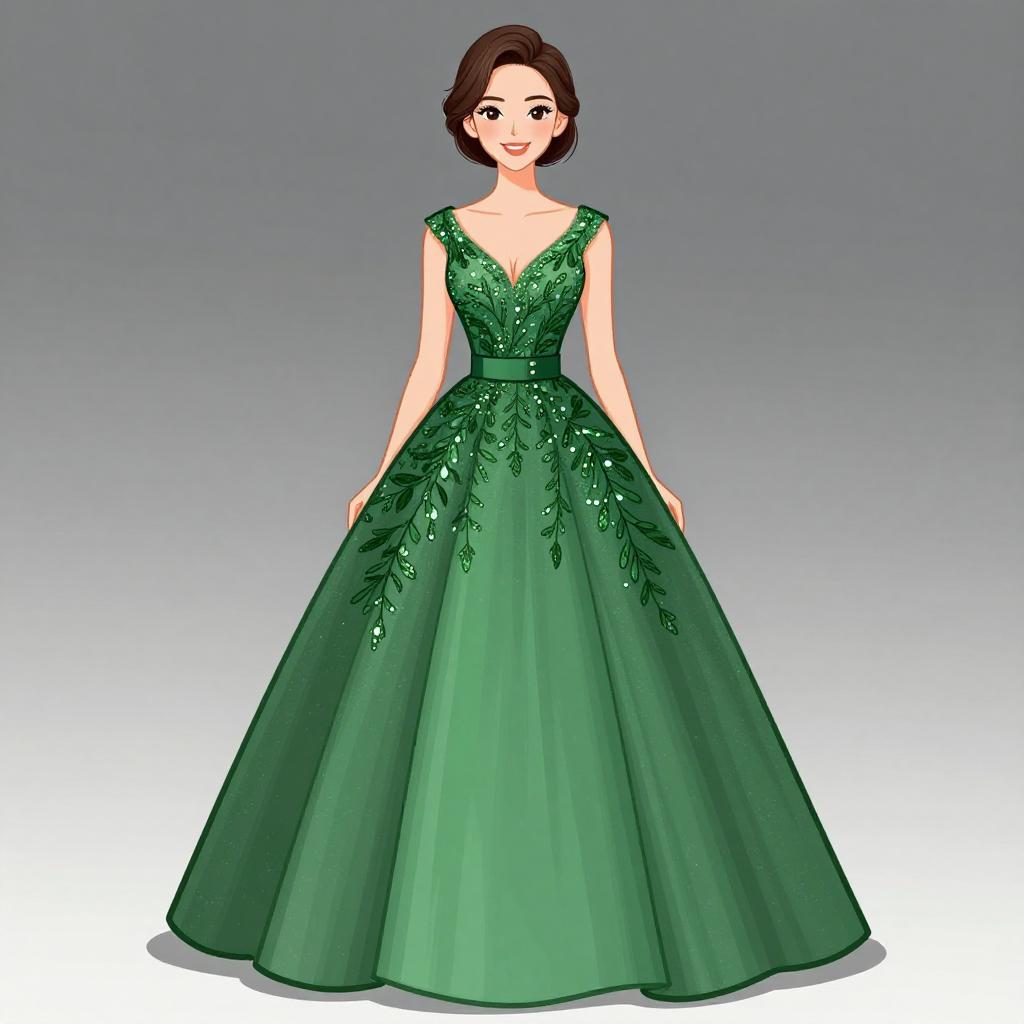 Woman with pretty face and pretty hair. smiling Woman, formal elegance, emerald green ball gown with sequined floral appliqués, V-neckline, sleeveless, fitted bodice, voluminous skirt, pocket detail, floor-length, A-line silhouette, matching fabric-covered belt, minimal jewelry, studio background with a light-to-dark gradient. --sref 1467