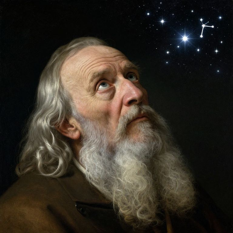 Create a portrait photograph of an aged sage, reminiscent of classical Dutch paintings. The sage should have weathered features, deep-set eyes, and a long white beard. Capture him from a high-angle perspective, looking up towards a celestial sphere of stars, as if they emit light directly onto his face, creating a mystical glow. The expression on the sage's face should be one of serene contemplation, as if he is studying the constellations in search of ancient wisdom, evoking a sense of reverence and awe for the universe's mysteries.