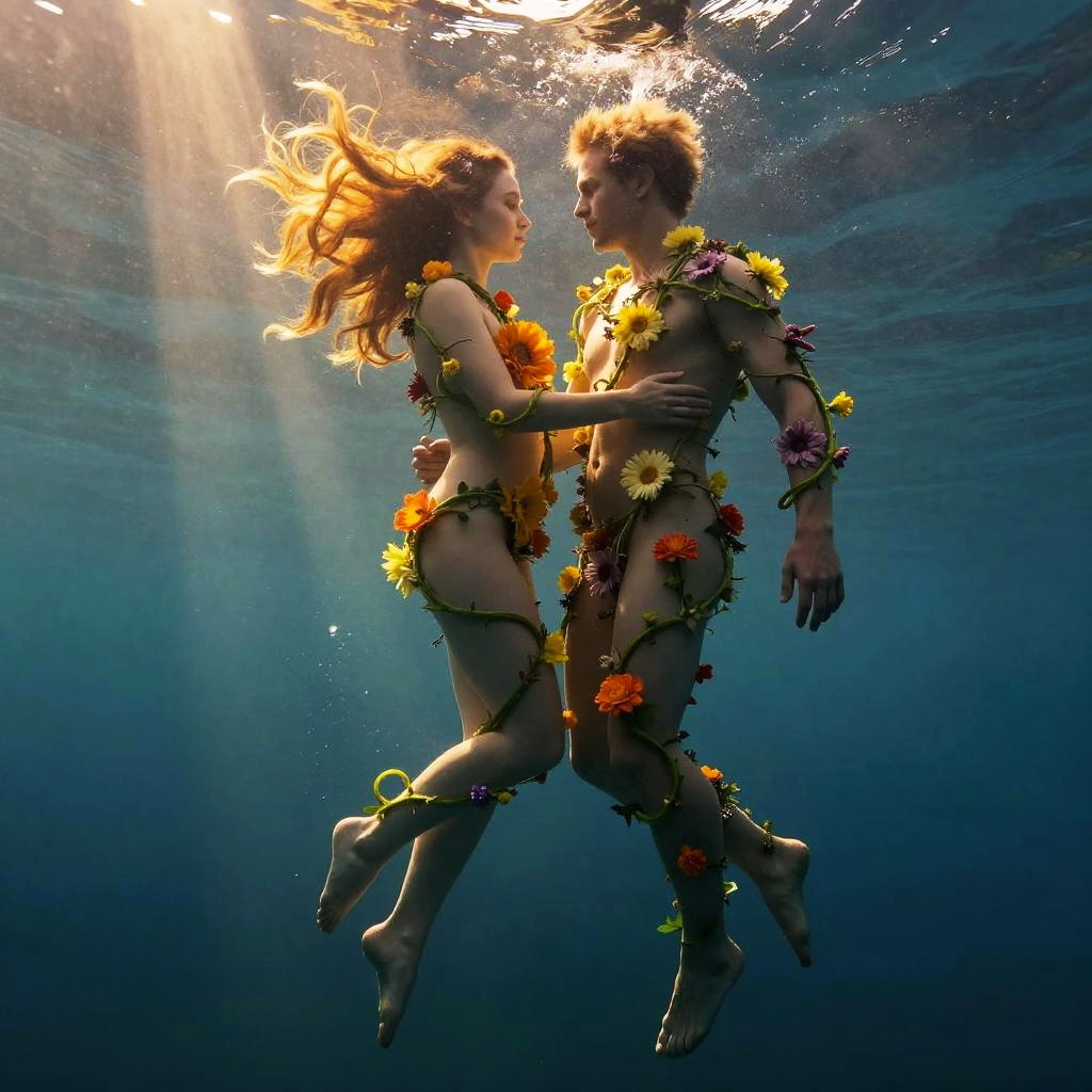 Realistic photo.closeup photo of 2 interconnected human bodies, 1 female, 1 male, connected by chaotic swirling vines made out of flowers, suspended underwater, by peter gric, artgerm, greg rutkowski, smooth gradients, vibrant colors, high contrast, artstation, golden hour, sunrays, cinematic, subsurface scattering, 4k, uhd, hdr realistic photo