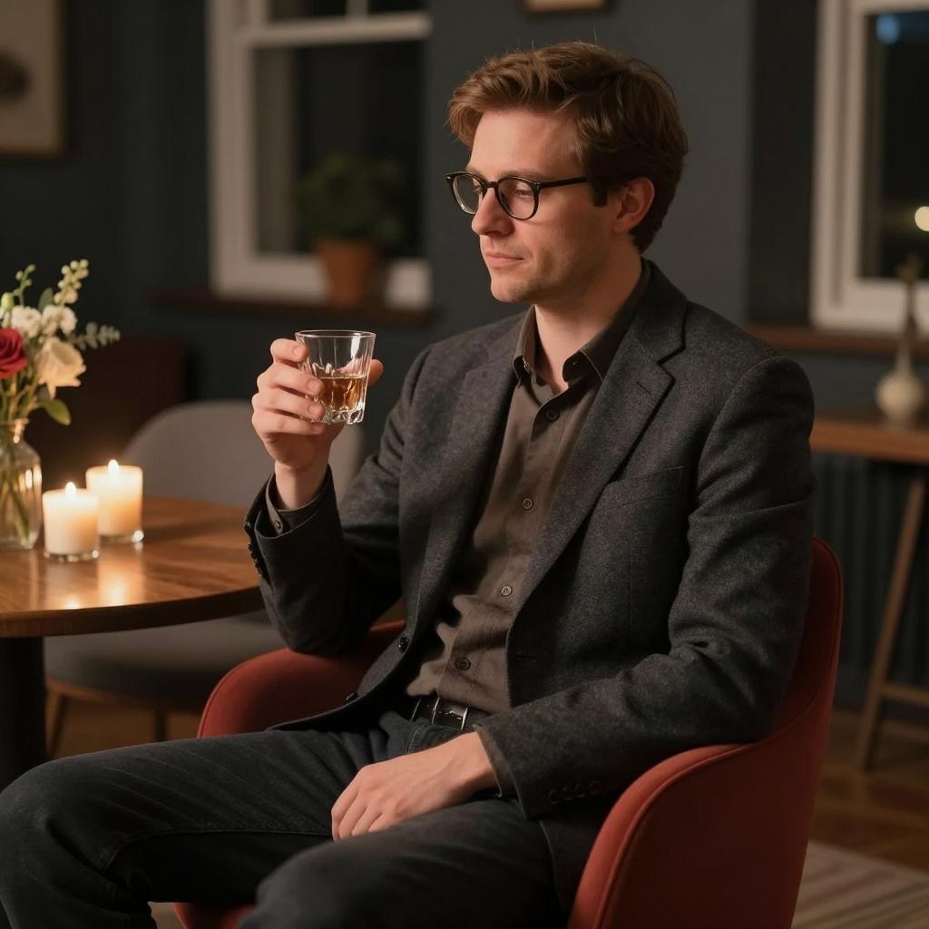 Man with short brown hair, glasses, wearing a dark gray blazer over a brown shirt, sits in a red chair, holding a small glass tumbler in his right hand. Background includes a wooden table with candles, flowers, and a gray chair. Dimly lit room with dark walls and windows.