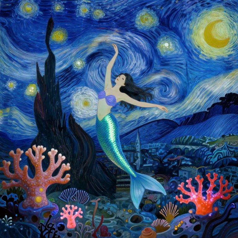 Craft an alluring image that blends the expressive Post-Impressionist brushstrokes reminiscent of Vincent van Gogh with the digital finesse of Qinni, portraying a tranquil nocturnal landscape where an otherworldly female figure gracefully dances within a field of luminous flowers under the watchful gaze of the moon. This aerial view from above accentuates the grandeur of the cosmic setting while highlighting her ethereal presence. As she moves, starlight caresses her gossamer gown, creating a mesmerizing dance of light and shadow that seems to blend with the surrounding hues of azure, emerald, and golden tones, inviting viewers into this serene dreamscape.