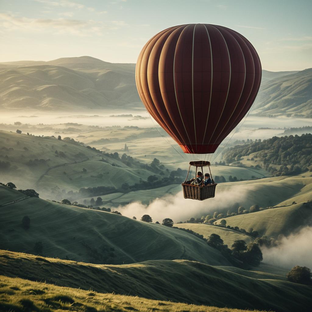 Vibrant hot air balloon in a sky with soft morning mist and warm glow. The plane looks like a geometric pattern balloon, and in a close-up frontal view. The plane’s face can be seen from afar in front of the poster