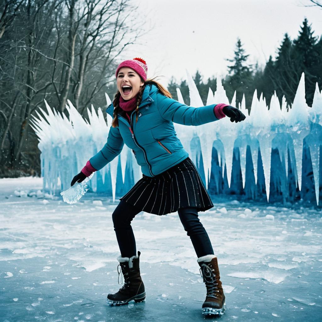 Scene of Anna doing a throwing ice spikes in a Frozen scene, humorous and vibrant.