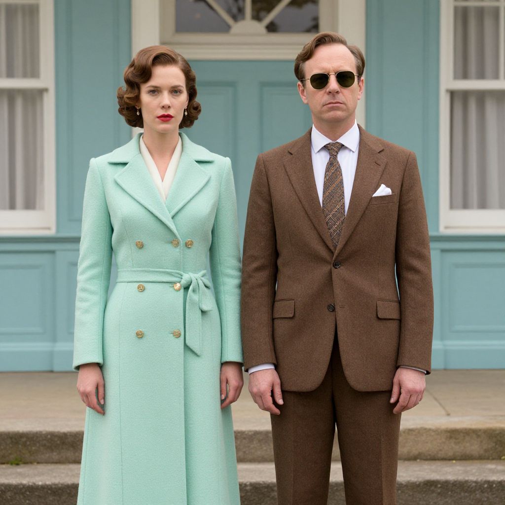 A photorealistic fashion shoot in the style of Wes Anderson and Alfred Hitchcock, featuring a man in a brown suit and a woman in a mint green coat with vintage hairstyles.