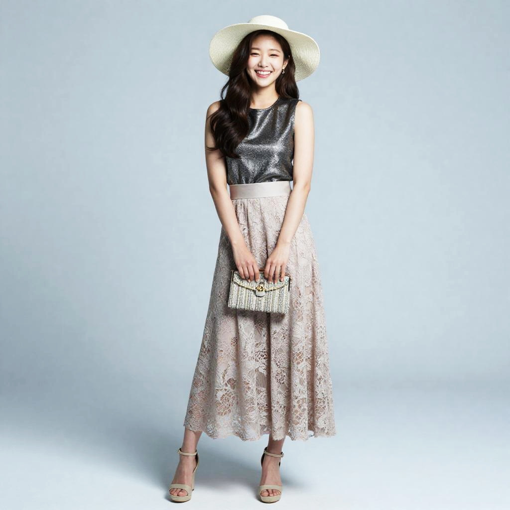 ((best_quality, high_resolution, distimct_image)), ultra_realistic details, sharp focus, detailed skin, detailed face, soft lighting, standing front_viewer, laugh shyly, (21years old pretty korean girl:1.2), (kpop idol:1.2)(, korean beauty:0.8), (korean mixed), hazy light_blue_background, 1girl, metallic top with a high-waisted skirt and heels., Lace maxi dress, wedge sandals, floppy hat, beaded clutch, soft waves.