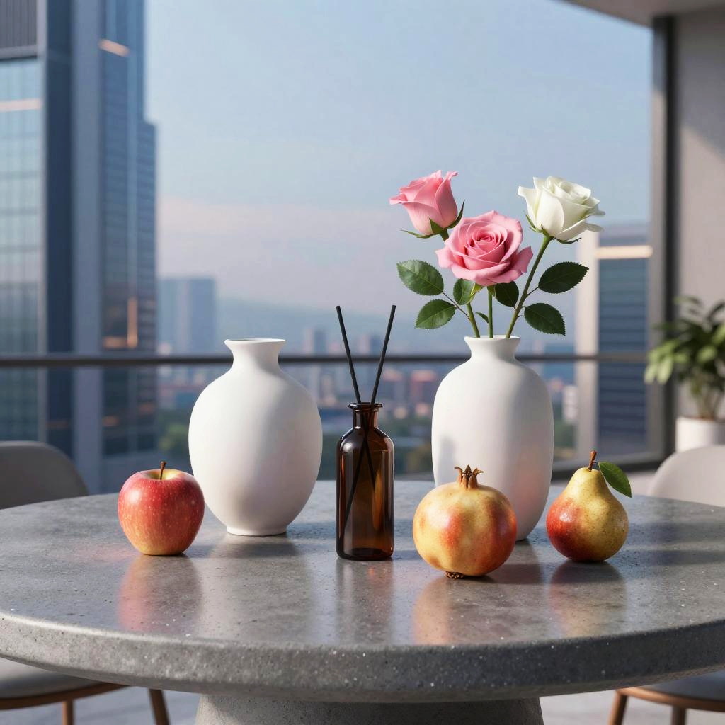 Digital matte painting, sleek concrete table in futuristic high-rise apartment, still-life featuring three white vases of varied shapes and a small brown bottle with a dark top; pink roses and white flowers with lively green leaves; fruits arranged around them: a red apple, a yellow-orange pomegranate, another red apple, and a small brown pear with a green leaf; soft blue hour twilight glow; realistic textures, crisp edges, gentle reflections, soft falloff, color-true, editorial quality