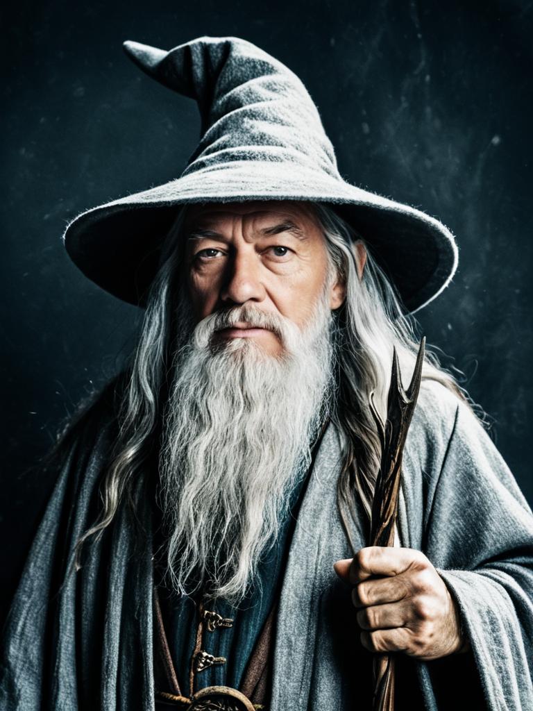 Man in Gandalf costume, cinematic realism, heroic wizard studio photo