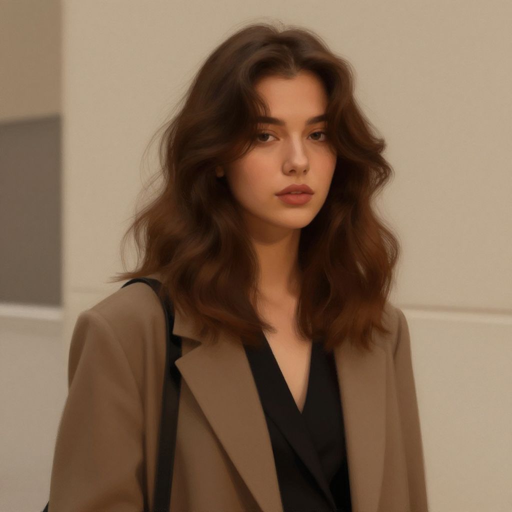 Aesthetic pfp brown hair portrait featuring a stylish young woman with wavy brown hair, trendy outfit, ambient soft light, urban minimalistic backdrop, warm earth tones, subtle grain texture, smooth skin, contemporary digital painting.