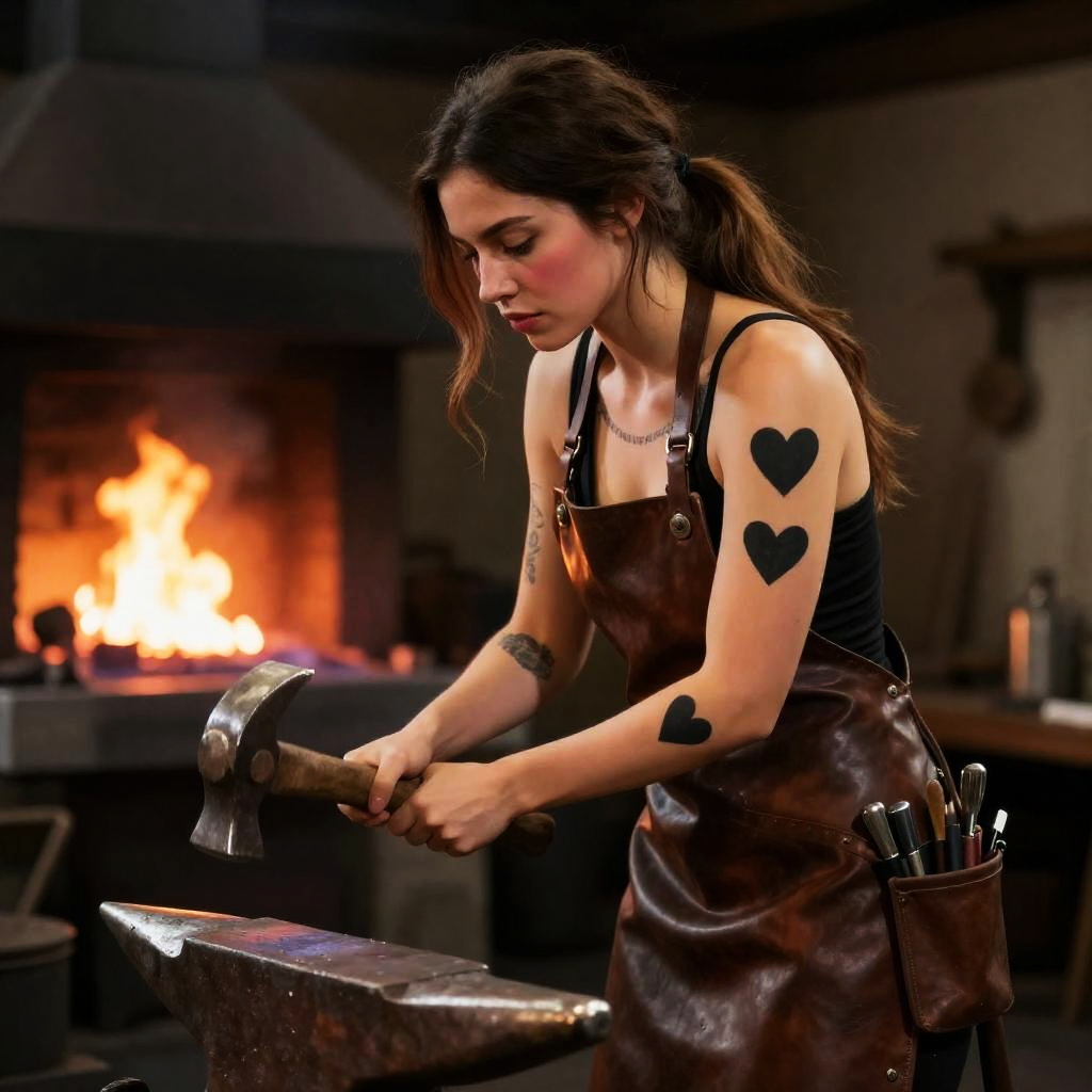 Score_9, score_8_up, score_7_up, realistic, 1girl, (solo:1.1), woman, blacksmith, black hearts, brown hair, long hair, tied hair, cleavage, blush, leather apron, focused, hammer and anvil, tool belt, forge background, tattoos