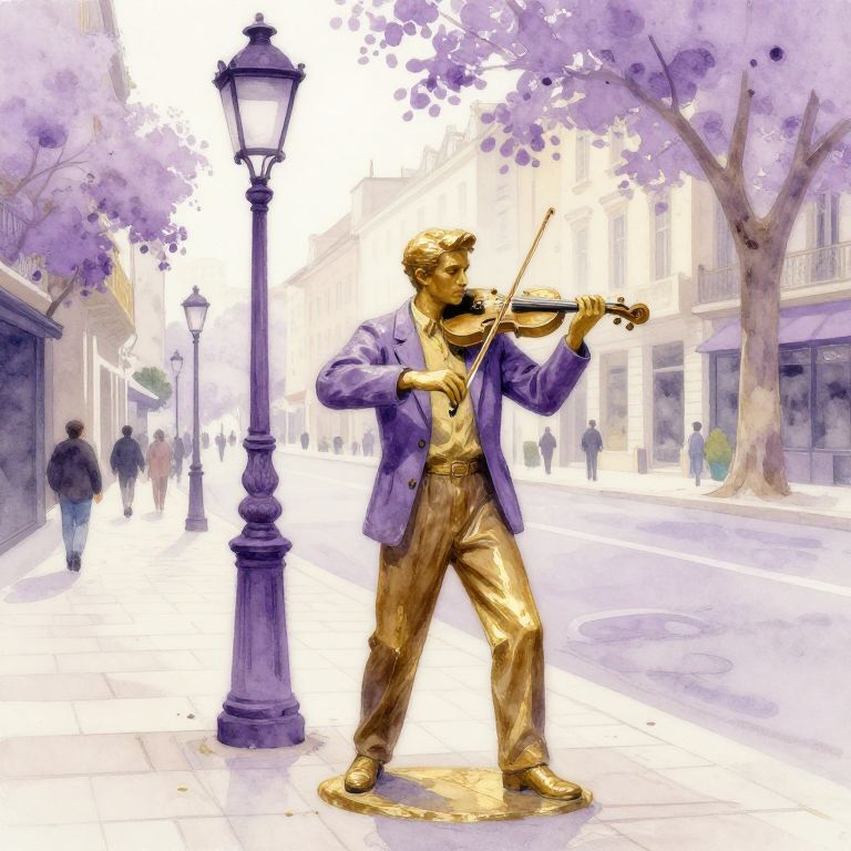 Bronze statue of a bearded man playing violin on a sunlit, purple-hued street with lampposts and pedestrians. Watercolor style