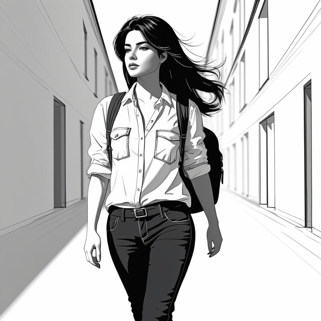High-contrast black and white detailed sketch of a young woman with long black hair walking confidently down a narrow alley between buildings. She wears a white button-up shirt with rolled-up sleeves, dark jeans, and a backpack. The urban setting is depicted with clear linear architectural elements and dramatic lighting, emphasizing the sharp lines and dynamic atmosphere.