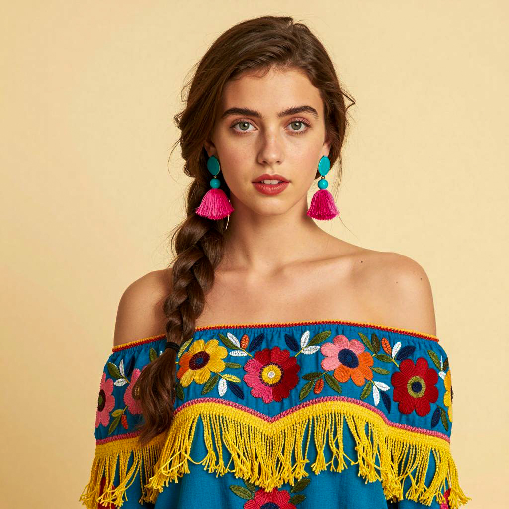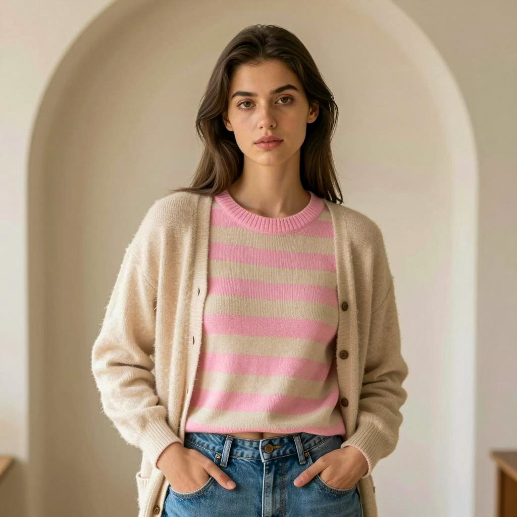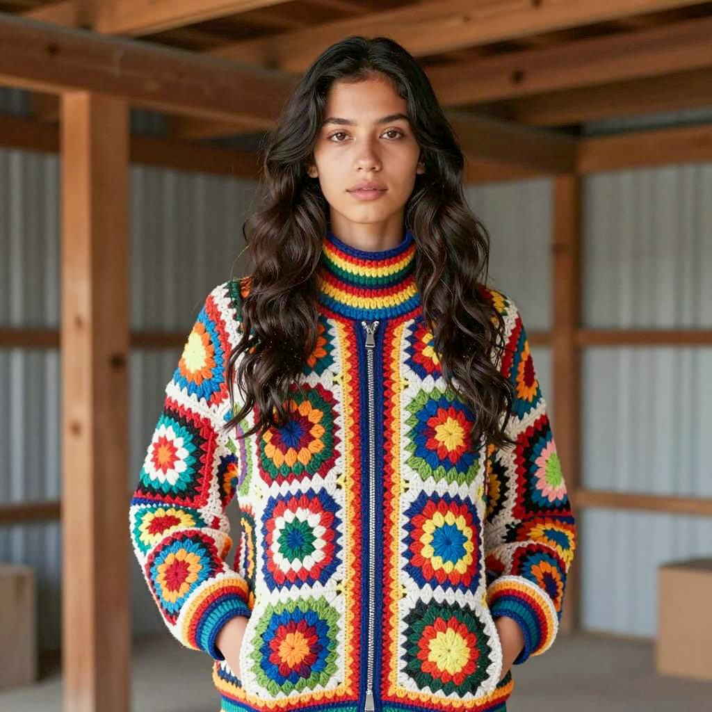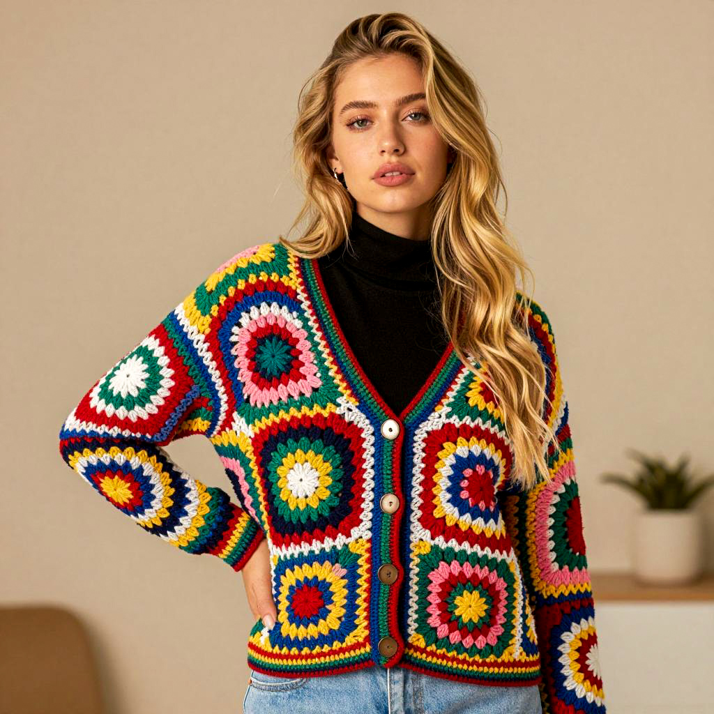 Photograph of a young woman with long, wavy blonde hair. She wears a colorful, crocheted cardigan with large, circular patterns and large buttons down the front. She has a black turtleneck and light blue jeans. Her right hand rests on her hip. The background is a blurred, warm-colored wall. She has a neutral expression. The cardigan's vibrant colors include red, green, yellow, pink, and blue. She is positioned slightly to the left.