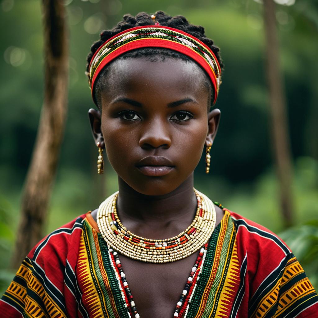 Efik traditional attire boy, photorealistic portrait of young African boy, dark skin, serious expression, traditional clothing, colorful patterned shirt, multiple gold necklaces, red headband with raised pattern, short braided hair, background blurred forest, natural light, detailed ures, ethnic fashion, traditional African attire, close-up, medium shot, realistic lighting, outdoors, traditional jewelry, traditional African style, subtle green background.