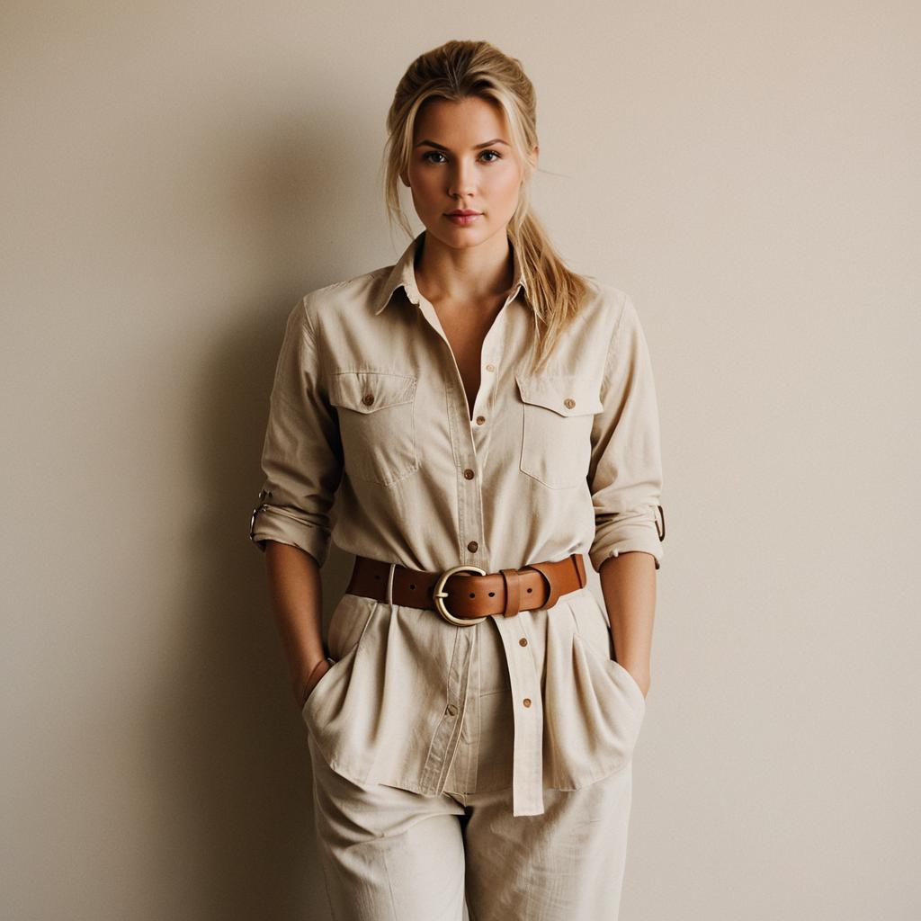 Blonde movie character, photograph of a blonde woman, standing against a plain beige wall, wearing a long beige button-up shirt and matching beige pants, brown leather belt with large circular buckle, serious expression, hair in a loose ponytail, natural light, minimalist style, casual outfit, realistic ure, neutral colors, fashion photography, portrait orientation