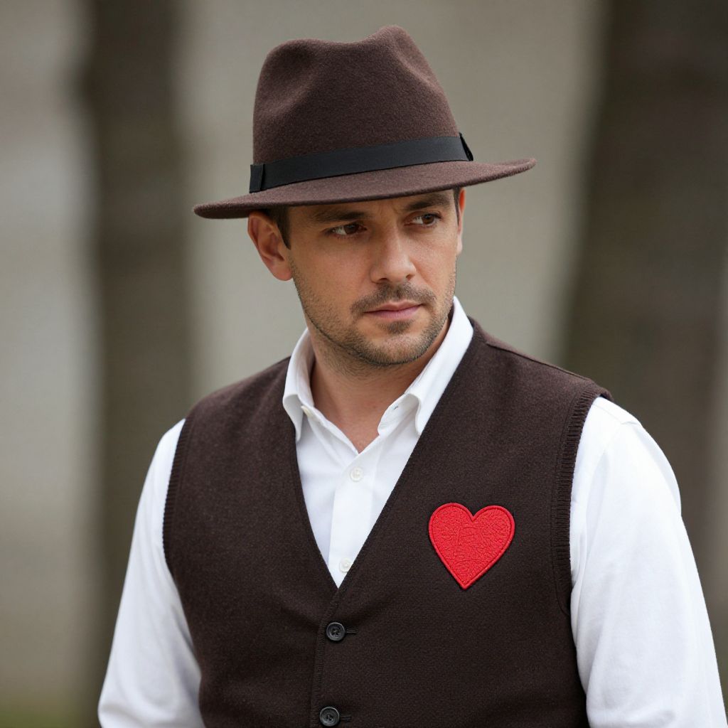 Man wearing a brown hat, brown vest, white shirt, and a red heart patch on his chest.