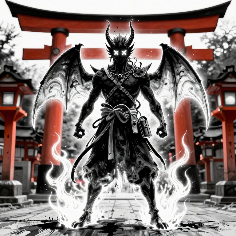 Digital artwork of a dark, horned demon with glowing eyes and wings, standing in front of a red torii gate, surrounded by white flames.