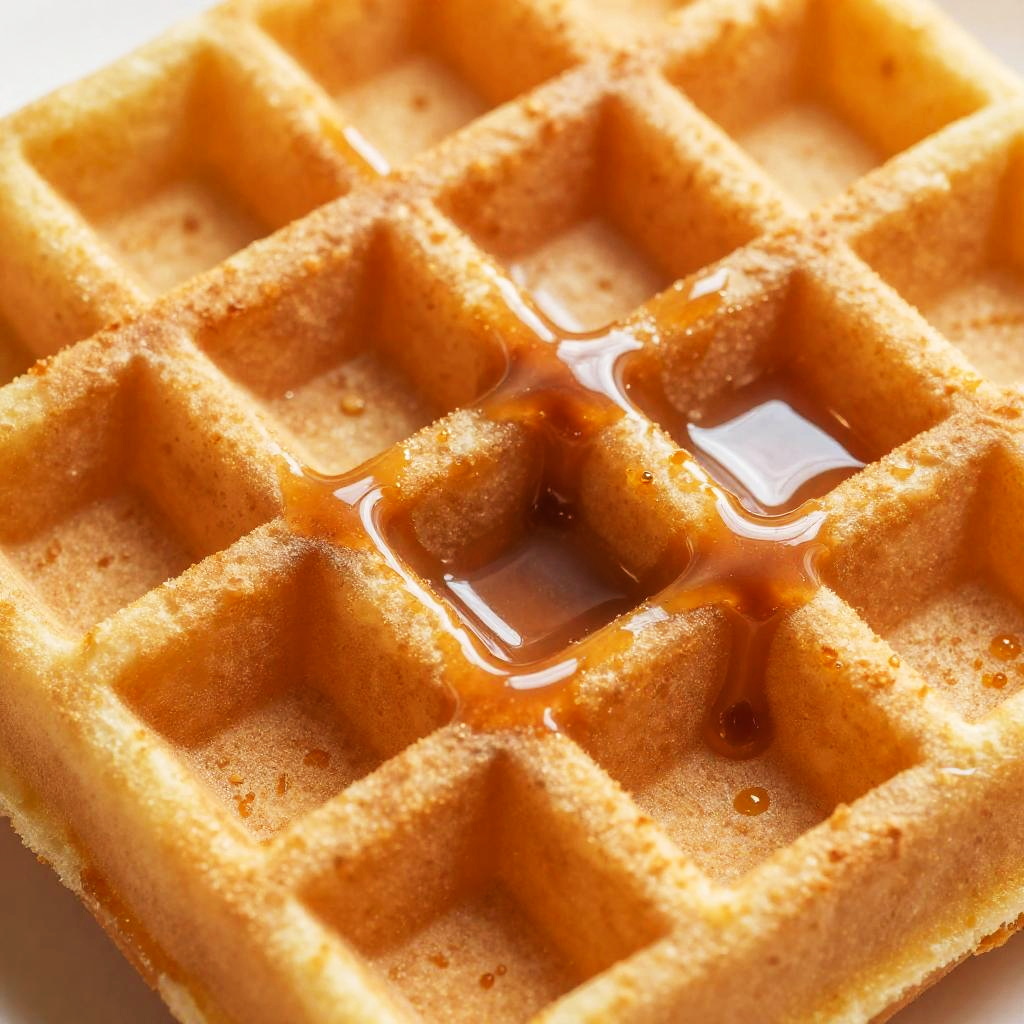 Close-up photo of a waffle with a golden-brown, crispy texture. The waffle is drizzled with shiny, dark chocolate syrup that pools in the square indentations. The syrup glistens under the light, highlighting the contrast between the waffle's crunchy surface and the smooth, rich chocolate. The image is highly detailed, focusing on the waffle's texture and the chocolate's sheen.
