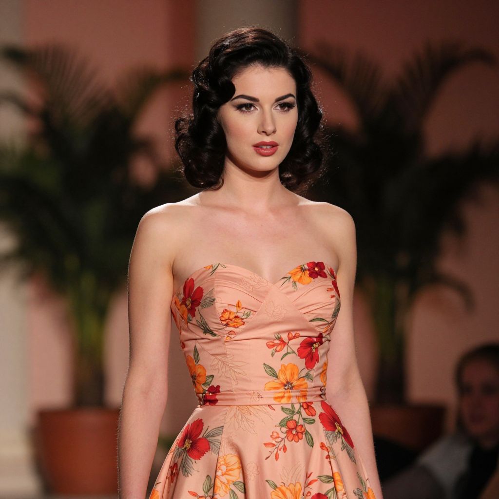 Photograph of a fair-skinned woman with dark brown, wavy hair styled in a 1950s retro fashion, wearing a pink headband. She's dressed in a light blue, sleeveless, floral-embellished dress with a pink waistband. She stands in a cream-colored room with a classic table lamp on a wooden side table in the background. She has a subtle smile and a confident pose.