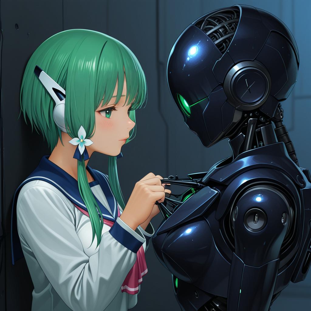 Digital illustration of an anime-style girl with short green hair, green eyes, and wearing a Japanese sailor school uniform (serafuku), gently embracing a detailed black robot with mechanical features. The girl wears robot ear accessories and a white flower hair ornament. The artwork features a futuristic and emotional theme with a dark, soft background.