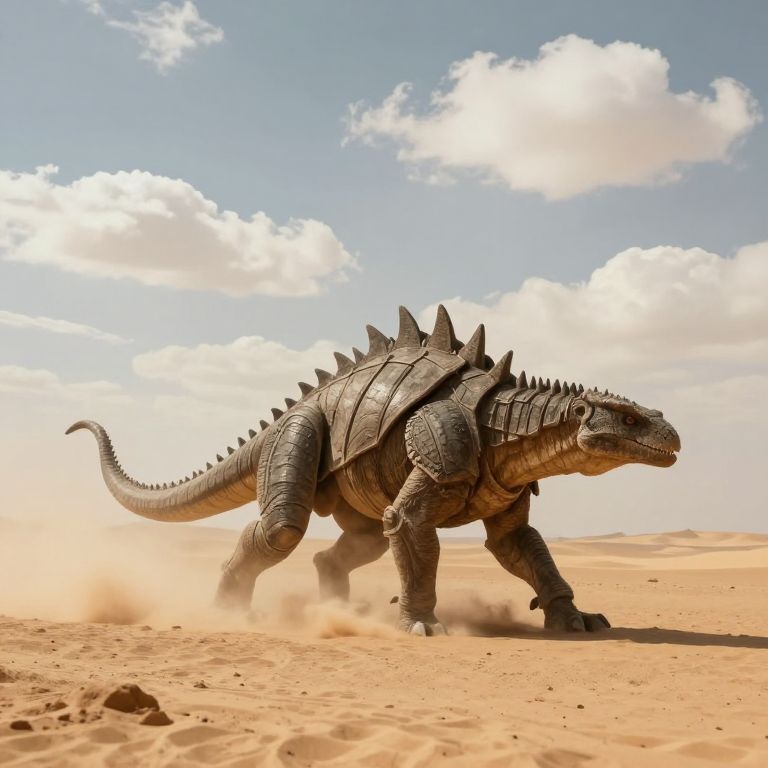 Massive armored reptilian creature with spiked dorsal plates and a curled tail strides powerfully across a desolate desert landscape, kicking up dust as it moves beneath a vast sky dotted with fluffy clouds.