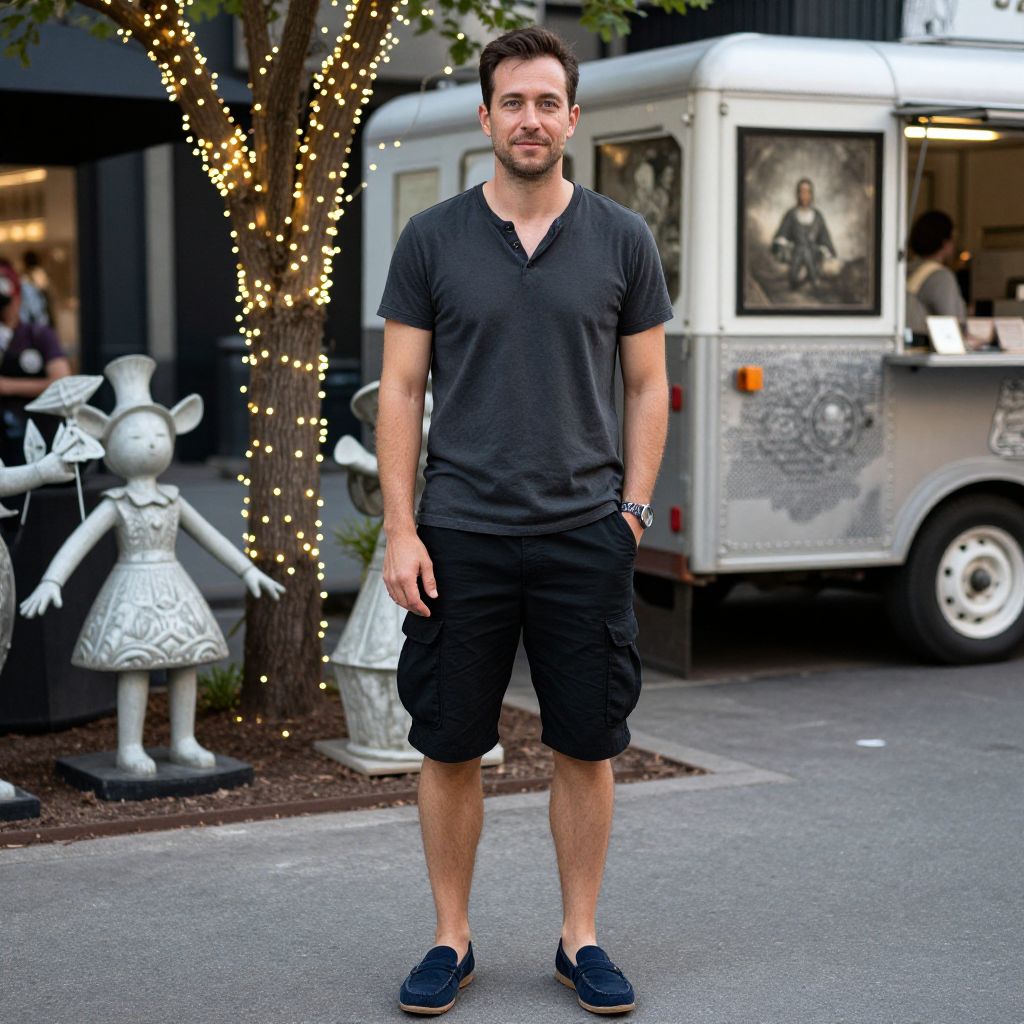 A man, charcoal Henley, black cargo shorts, dark blue slip-on loafers, urban street style, twinkling lights, eclectic sculptures, food trucks, collodion wet plate, relaxed smile, casual confidence. Man has masculine face and piercing eyes