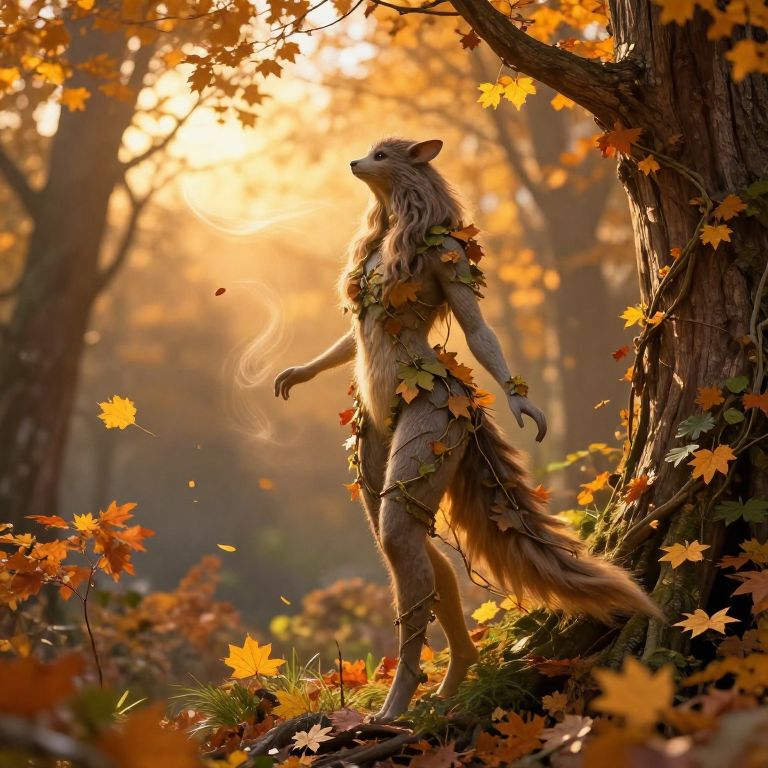 Digital art of an anthropomorphic wolf with autumn leaves as clothing, standing in a sunlit forest, surrounded by glowing orange leaves.