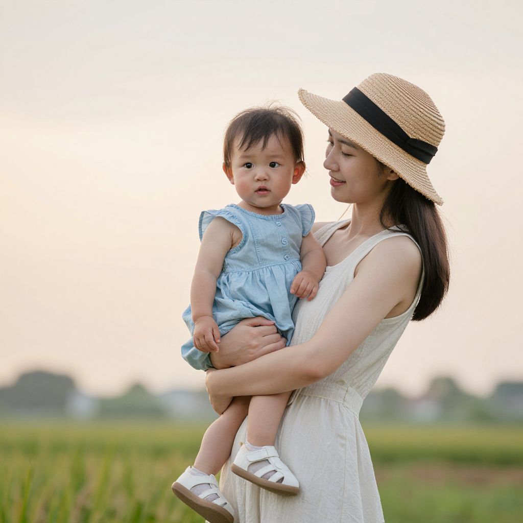 Woman wearing a straw hat and sleeveless dress gently holds a young child in a light blue dress, set against a serene rural landscape under a soft, golden sky.