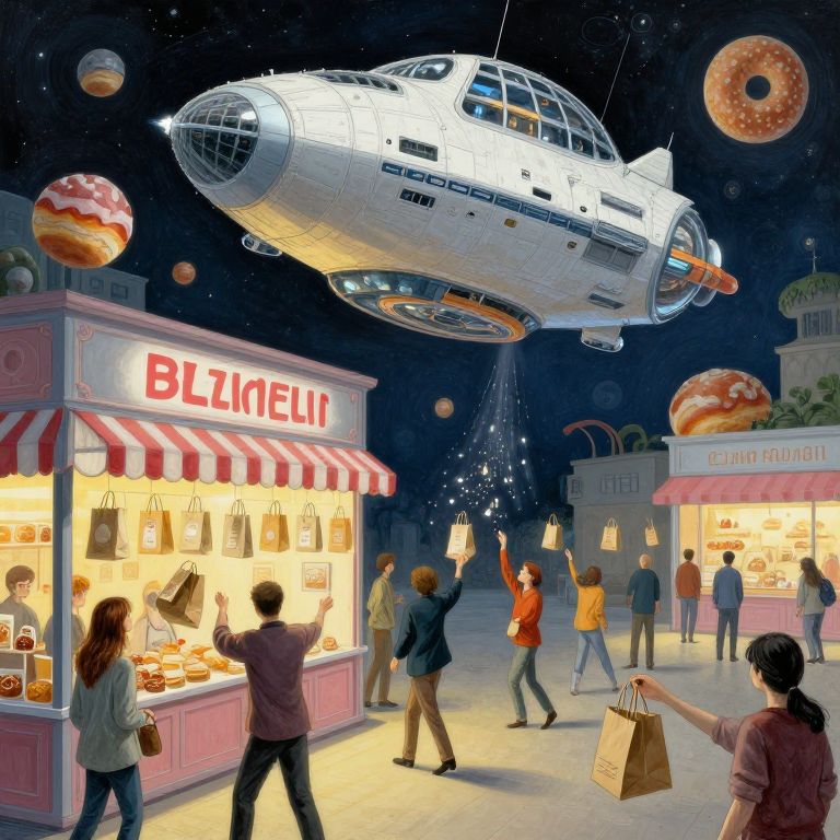 This vibrant digital illustration depicts a futuristic street scene at night. A white, retro-style spaceship with a glass dome hovers above a bustling sidewalk. Neon-lit "Blitzel" kiosks, resembling pastel pink and white bakeries, sell pastries and snacks. Several people, dressed in casual modern clothing, walk and shop, holding bags. The background features a starry sky with floating doughnuts and planets. The scene blends sci-fi elements with everyday life, creating a whimsical and imaginative atmosphere. The colors are bright and contrasting, emphasizing the surreal setting.