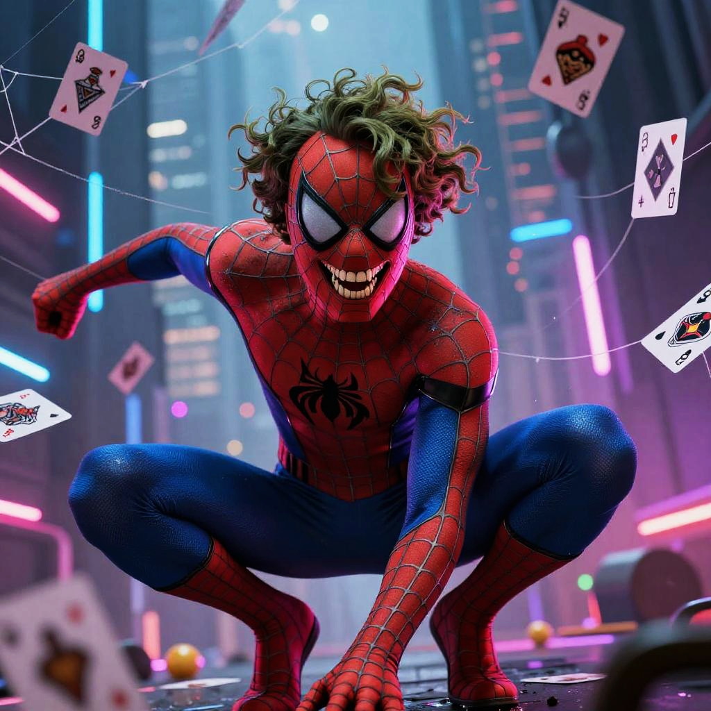 The spider man who laughs, hybrid between Spider-Man and Batman’s Joker, chaotic energy, sharp teeth, spider webs tangled with Joker playing cards, vivid neon colors, cyberpunk metropolis environment, cinematic atmosphere