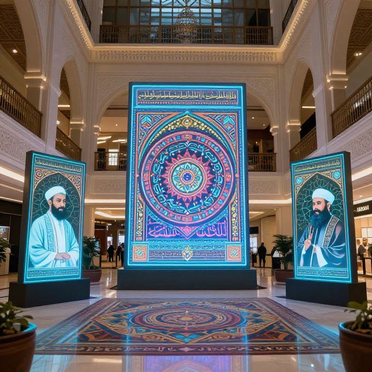 Islamic AI prompts: A fusion of Islamic heritage and AI innovation in a smart city center, where AI displays Quranic knowledge through holographic projections of Sufi poets and geometric designs in vibrant, culturally rich colors.