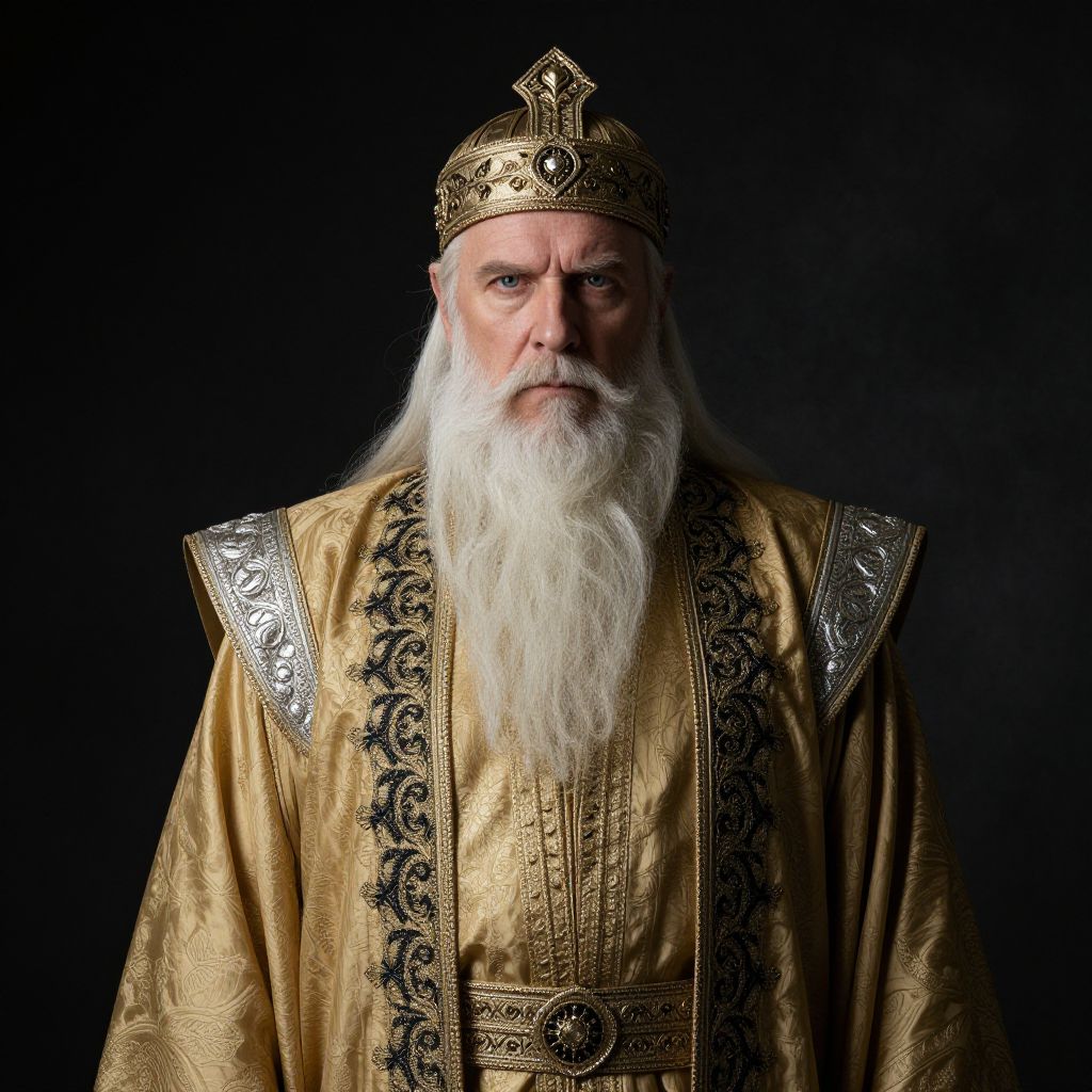 A man with a long white beard and a purple and white robe with a crown on his head is standing in front of a gold building.