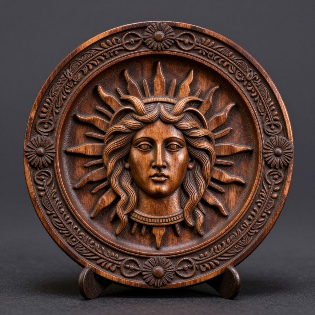 This photograph showcases an intricately carved wooden circular plaque featuring a sun-like face with a serene expression. The face, positioned at the center, has flowing wavy hair radiating outward, resembling sun rays. The sun face has detailed eyes, a straight nose, and slightly parted lips. Surrounding the face is an ornate border with floral and leaf patterns. The wood has a rich, dark brown hue, highlighted by the carving's depth and texture. The plaque is supported by three small, rounded legs. The background is a solid, dark gray, emphasizing the wood's natural grain and the intricate carvings.