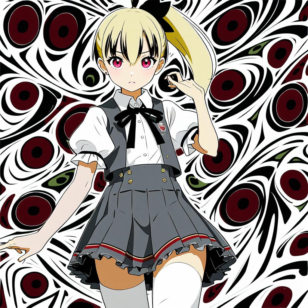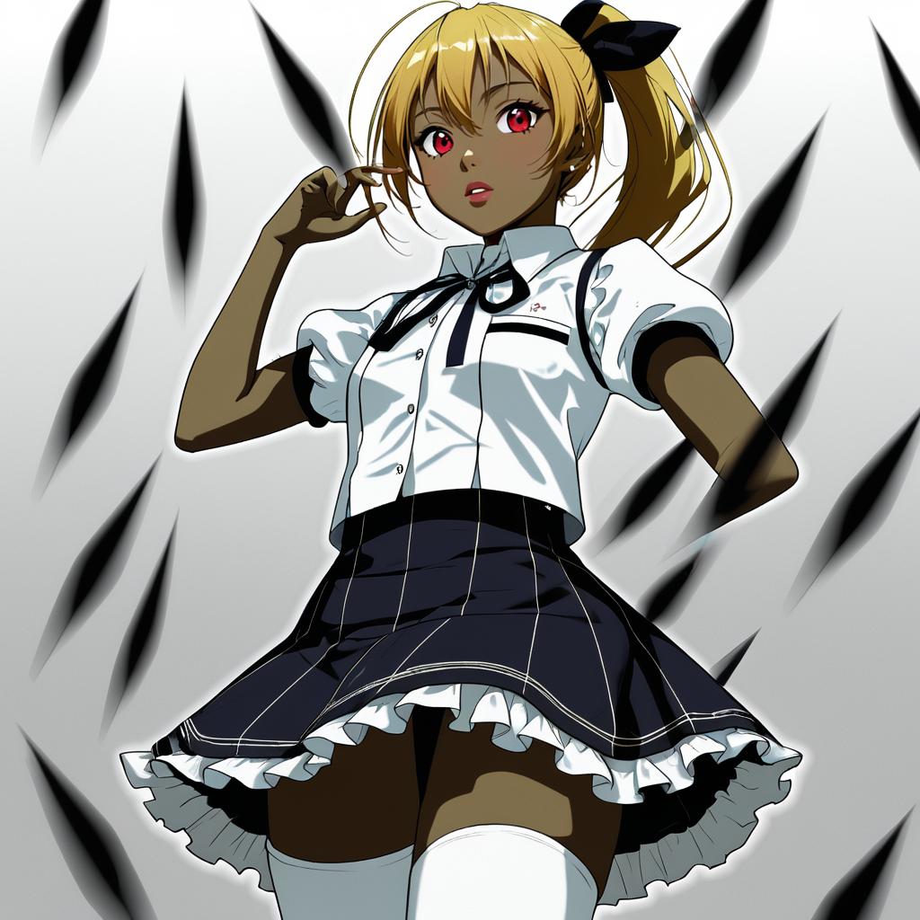 Andou tazusa, assault lily, 1girl, hand up, red eyes, hair between eyes, blonde hair, short hair, ponytail, ahoge, high ponytail, hair ribbon, medium breasts, yurigaoka girls academy school uniform, yurigaoka girls academy school uniform, cropped jacket, white shirt, black skirt, white thighhighs, high-waist skirt, frilled skirt, black ribbon, neck ribbon, juliet sleeves, miniskirt, buttons, by artist lewdamone, anime