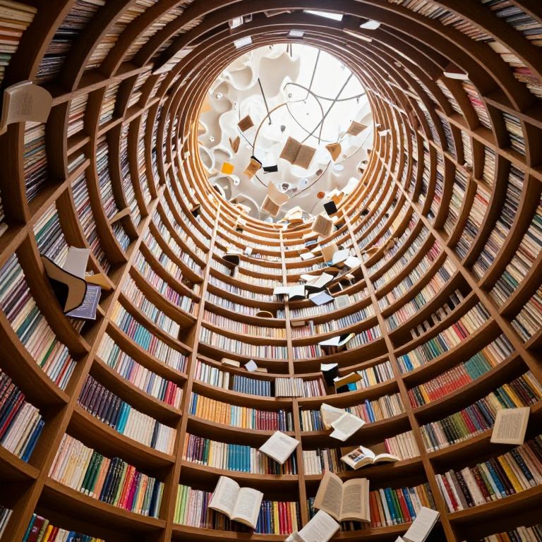Doughnut-shaped library spirals infinitely upward, its wooden shelves lined with colorful books that cascade toward a sunlit opening, revealing a chaotic yet mesmerizing scene of scattered volumes and open pages beneath a textured, cloud-like ceiling.