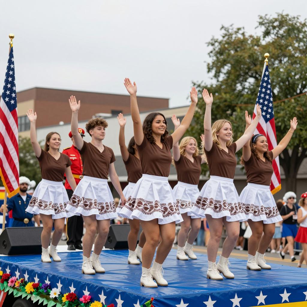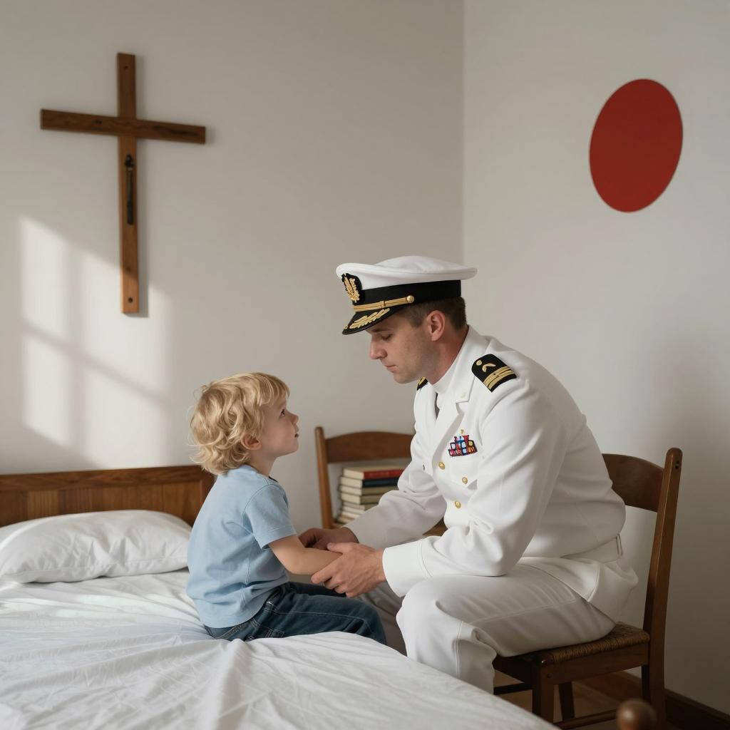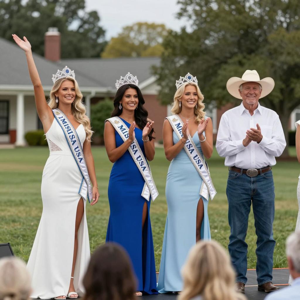 Photograph of a memorial. Man in green vest and white shirt kneels on right, holding his head. Young girl in red shirt and black hat stands on his left. Group of people, some in red hats, stand and kneel on left, paying respects. American flags and yellow flowers on ground. Black mesh wall in background. Trees and sky in background. Several people in casual clothes. Man in front left wearing plaid shirt. Woman in white blouse and patterned skirt on right. Clear, sunny day.